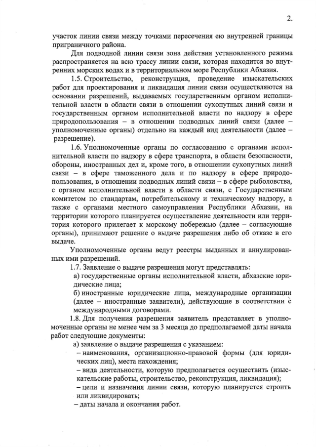 Постановление Кабинета Министров Республики Абхазия от 28.12.2016 № 239 "Об утверждении "Положения о строительстве и эксплуатации линий связи при пересечении государственной границы Республики Абхазия на приграничной территории, во внутренних морских водах и в территориальном море Республики Абхазия"