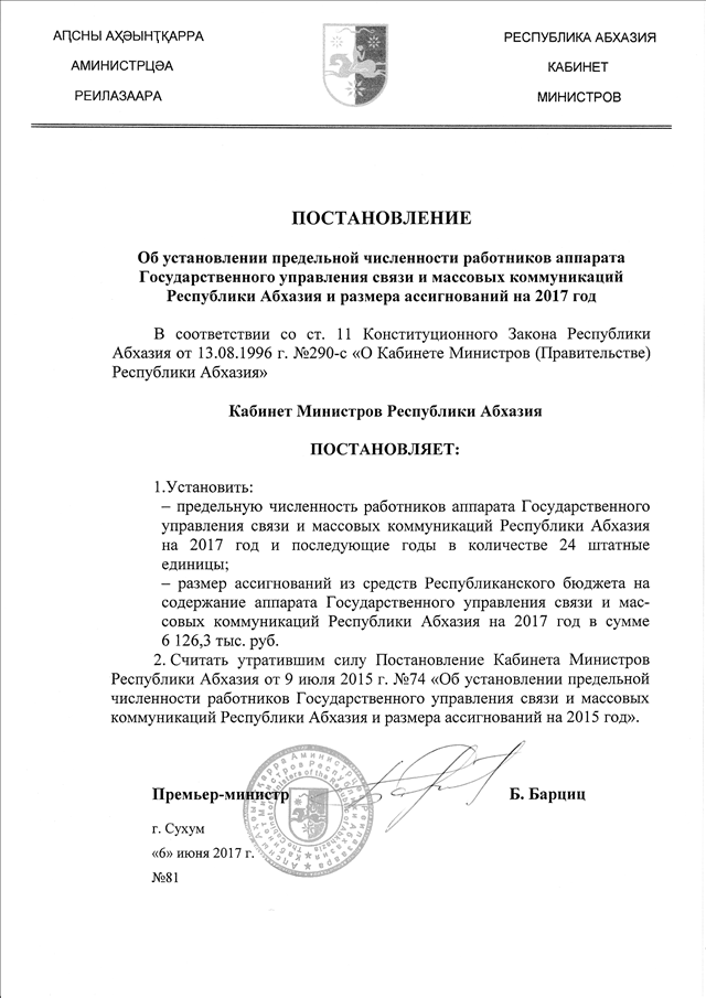 Постановление Кабинета Министров Республики Абхазия от 06.06.2017 № 81 "Об установлении предельной численности работников аппарата Государственного управления связи и массовых коммуникаций Республики Абхазия и размера ассигнований на 2017 год"