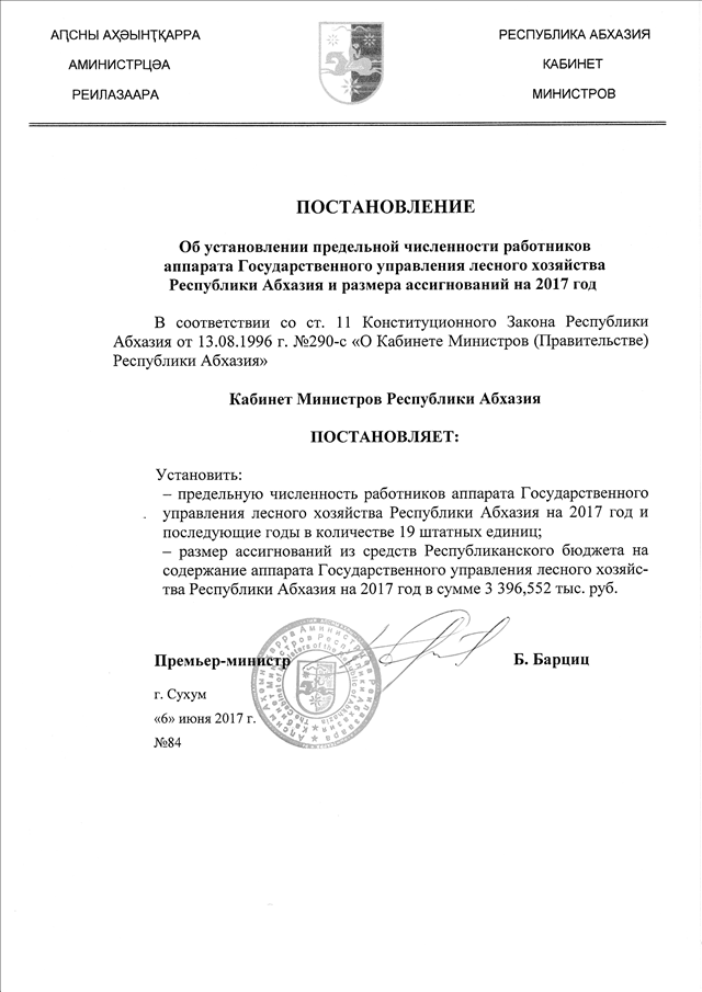 Постановление Кабинета Министров Республики Абхазия от 06.06.2017 № 84 "Об установлении предельной численности работников аппарата Государственного управления лесного хозяйства Республики Абхазия и размера ассигнований на 2017 год"