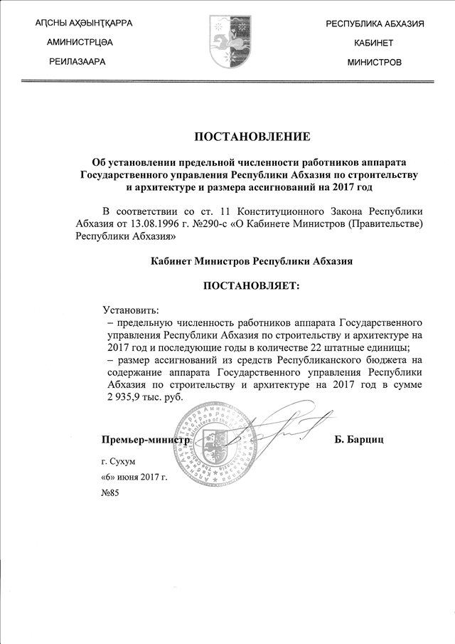 Постановление Кабинета Министров Республики Абхазия от 06.06.2017 № 85 "Об установлении предельной численности работников аппарата Государственного управления Республики Абхазия по строительству и архитектуре и размера ассигнований на 2017 год"