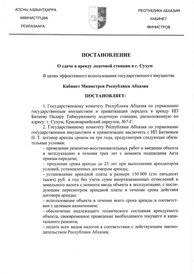 Постановление Кабинета Министров Республики Абхазия от 26.07.2017 № 121 "О сдаче в аренду лодочной станции в г. Сухум"