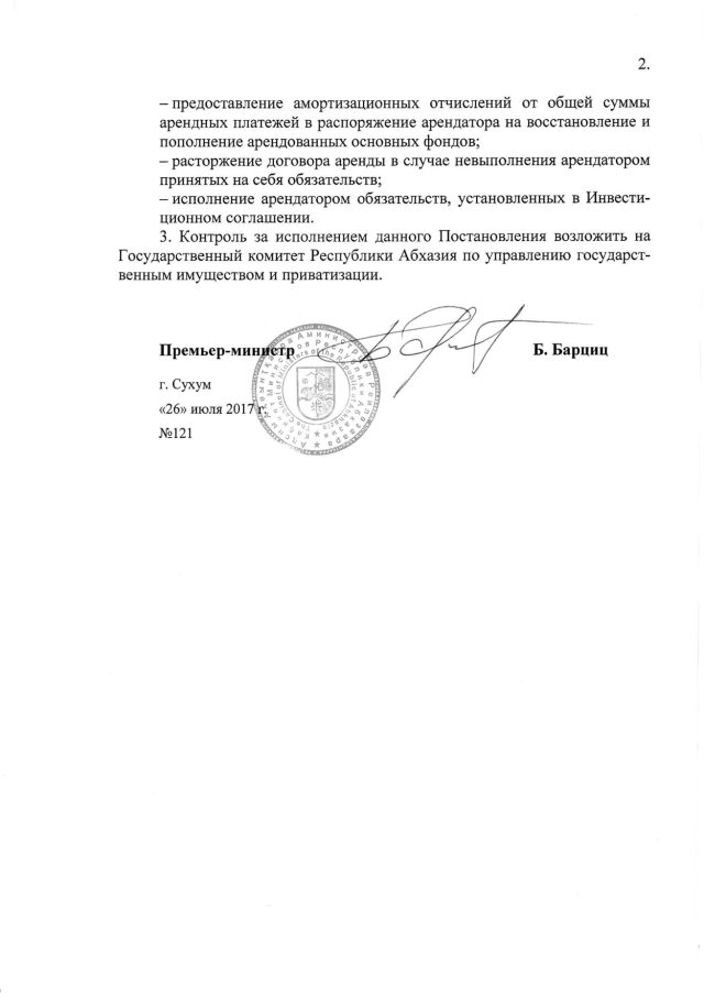 Постановление Кабинета Министров Республики Абхазия от 26.07.2017 № 121 "О сдаче в аренду лодочной станции в г. Сухум"