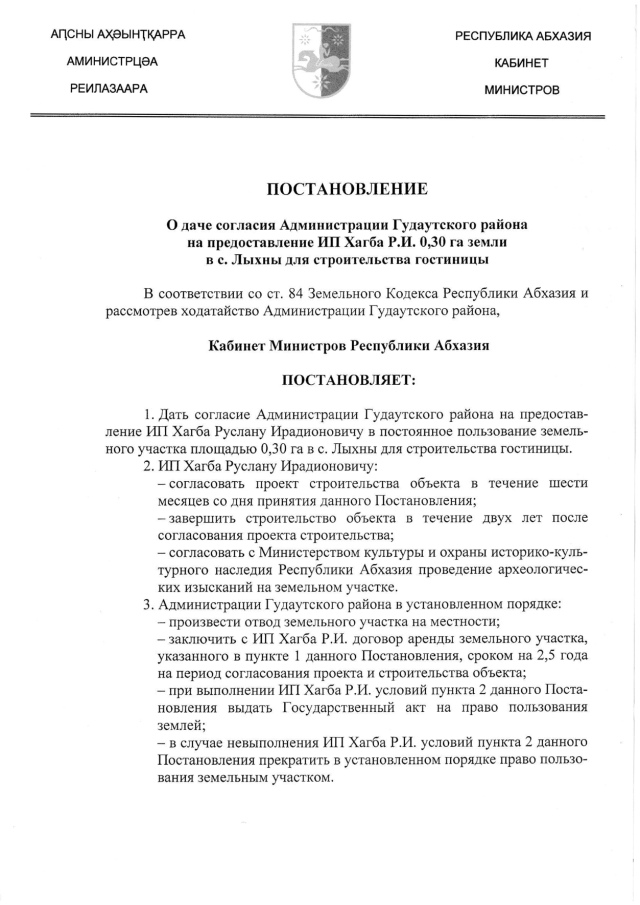 Постановление Кабинета Министров Республики Абхазия от 26.07.2017 № 124 "О даче согласия Администрации Гудаутского района на предоставление ИП Хагба Р.И. 0,30 га земли в с. Лыхны для строительства гостиницы"