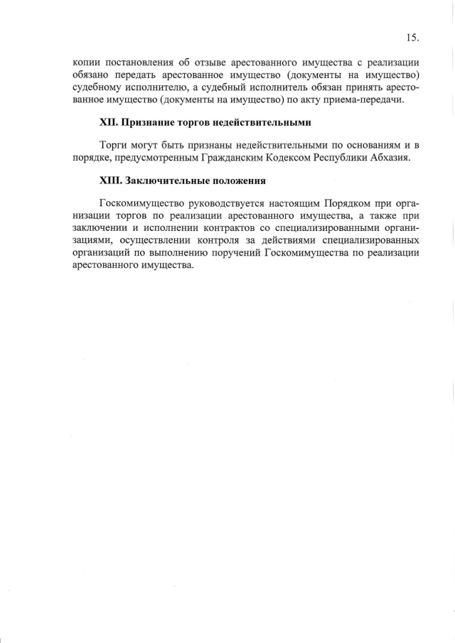 Постановление Кабинета Министров Республики Абхазия от 18.09.2018 № 134 "Об утверждении "Порядка организации и проведения продажи (реализации на торгах) имущества должника, арестованного во исполнение судебных решений или актов органов, которым предоставлено право принимать решения об обращении взыскания на имущество"