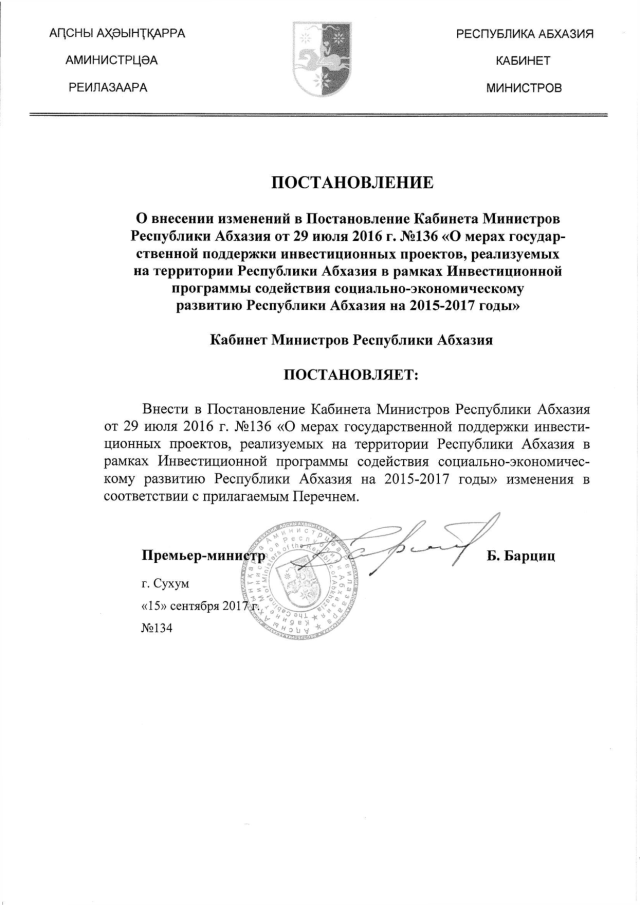Постановление Кабинета Министров Республики Абхазия от 15.09.2018 № 134 "О внесении изменений в Постановление Кабинета Министров Республики Абхазия от 29 июля 2016 г. № 136 "О мерах государственной поддержки инвестиционных проектов, реализуемых на территории Республики Абхазия в рамках Инвестиционной программы содействия социально-экономическому развитию Республики Абхазия на 2015-2017 годы"