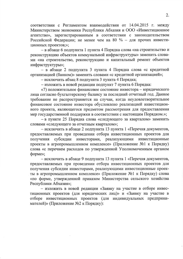 Постановление Кабинета Министров Республики Абхазия от 15.09.2018 № 134 "О внесении изменений в Постановление Кабинета Министров Республики Абхазия от 29 июля 2016 г. № 136 "О мерах государственной поддержки инвестиционных проектов, реализуемых на территории Республики Абхазия в рамках Инвестиционной программы содействия социально-экономическому развитию Республики Абхазия на 2015-2017 годы"
