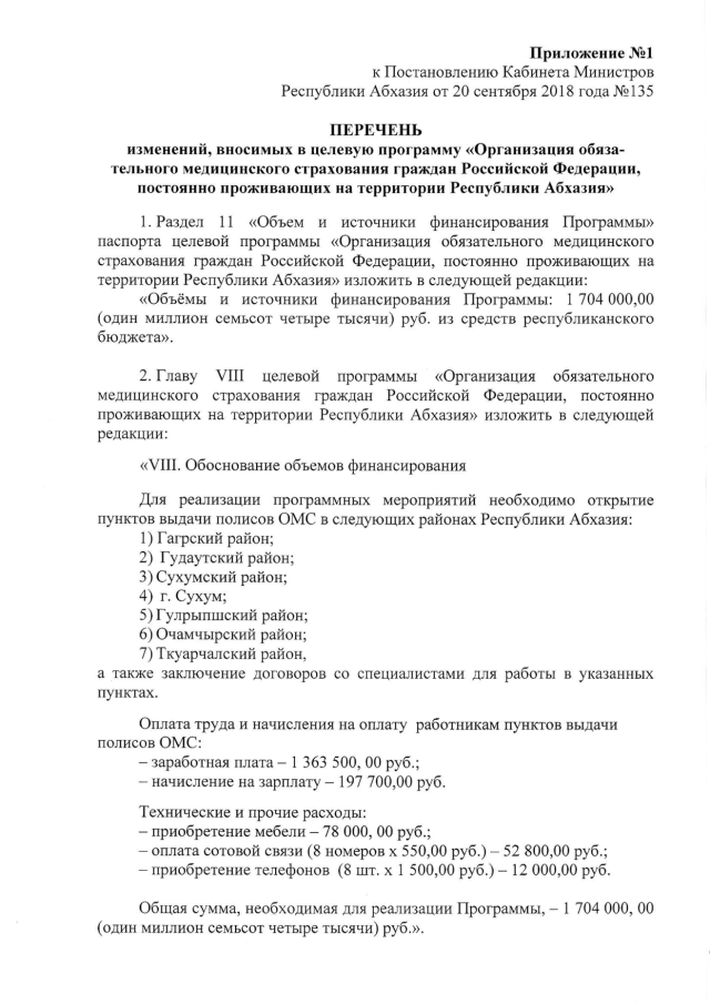 Постановление Кабинета Министров Республики Абхазия от 20.09.2018 № 135 "О внесении изменений в некоторые акты Кабинета Министров Республики Абхазия в сфере здравоохранения"