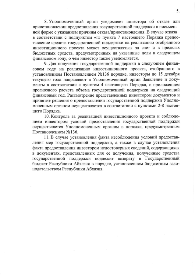 Постановление Кабинета Министров Республики Абхазия от 15.09.2017 № 135 "Об утверждении "Порядка предоставления государственной поддержки инвестиционных проектов, отобранных для предоставления государственной поддержки в рамках Инвестиционной программы содействия социально-экономическому развитию Республики Абхазия на 2017-2019 годы"