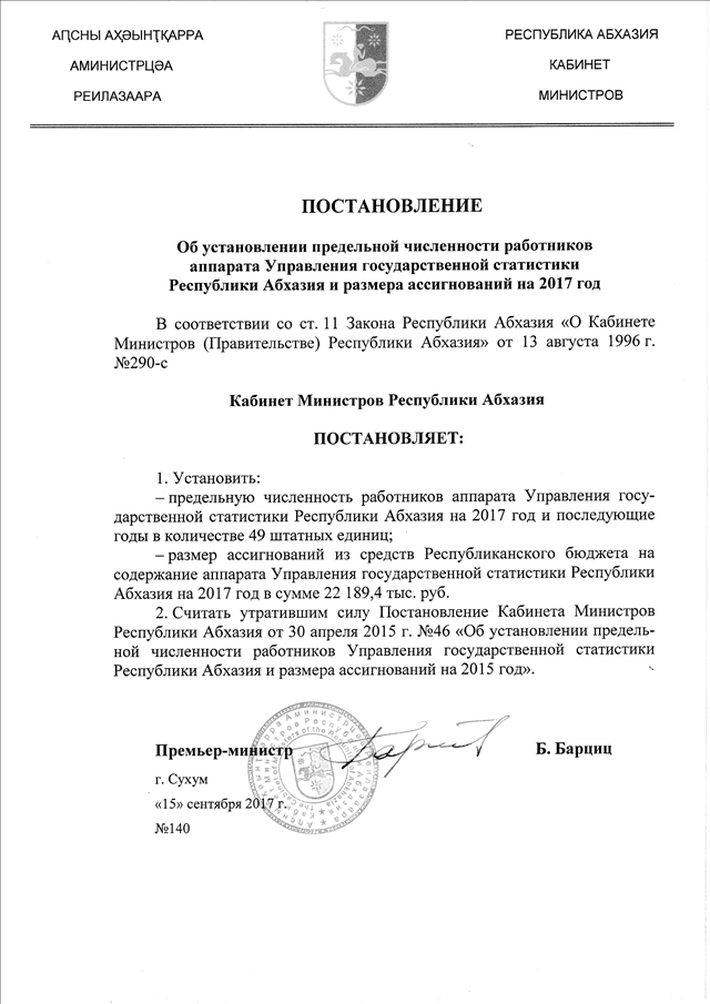 Постановление Кабинета Министров Республики Абхазия от 15.09.2017 № 140 "Об установлении предельной численности работников аппарата Управления государственной статистики Республики Абхазия и размера ассигнований на 2017 год"