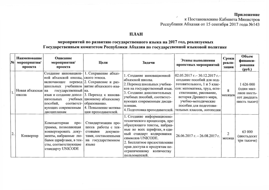 Постановление Кабинета Министров Республики Абхазия от 15.09.2017 № 143 "Об утверждении "Плана мероприятий по развитию государственного языка на 2017 год, реализуемых Государственным комитетом Республики Абхазия по государственной языковой политике"