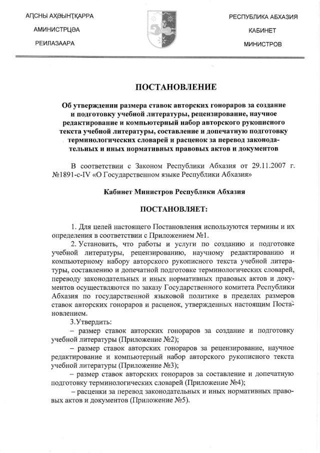 Постановление Кабинета Министров Республики Абхазия от 15.09.2017 № 144 "Об утверждении размера ставок авторских гонораров за создание и подготовку учебной литературы, рецензирование, научное редактирование и компьютерный набор авторского рукописного текста учебной литературы, составление и допечатную подготовку терминологических словарей и расценок за перевод законодательных и иных нормативных правовых актов и документов"