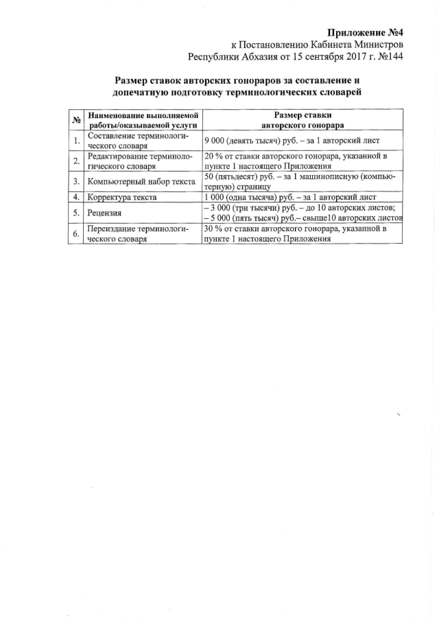 Постановление Кабинета Министров Республики Абхазия от 15.09.2017 № 144 "Об утверждении размера ставок авторских гонораров за создание и подготовку учебной литературы, рецензирование, научное редактирование и компьютерный набор авторского рукописного текста учебной литературы, составление и допечатную подготовку терминологических словарей и расценок за перевод законодательных и иных нормативных правовых актов и документов"