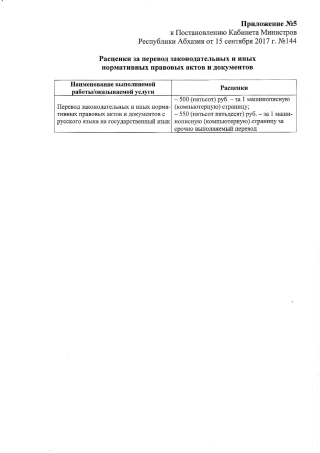 Постановление Кабинета Министров Республики Абхазия от 15.09.2017 № 144 "Об утверждении размера ставок авторских гонораров за создание и подготовку учебной литературы, рецензирование, научное редактирование и компьютерный набор авторского рукописного текста учебной литературы, составление и допечатную подготовку терминологических словарей и расценок за перевод законодательных и иных нормативных правовых актов и документов"