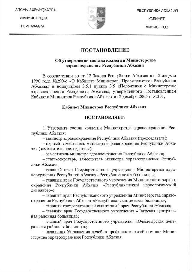 Постановление Кабинета Министров Республики Абхазия от 15.09.2017 № 146 "Об утверждении состава коллегии Министерства здравоохранения Республики Абхазия"