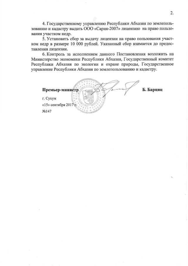 Постановление Кабинета Министров Республики Абхазия от 15.09.2017 № 147 "О предоставлении ООО "Сария-2007" права пользования участком недр в пойме реки Хыпста в Гудаутском районе"