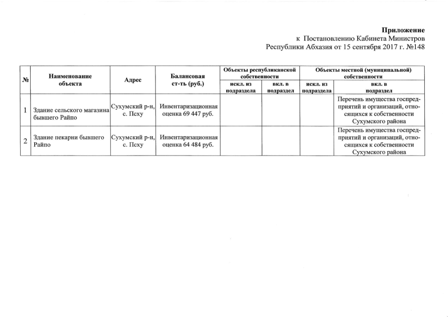 Постановление Кабинета Министров Республики Абхазия от 15.09.2017 № 148 "О внесении дополнений в Постановление Кабинета Министров Республики Абхазия от 06.06.2002 г. № 117 "О порядке оформления разграничения государственной собственности и формирования Реестра собственности"