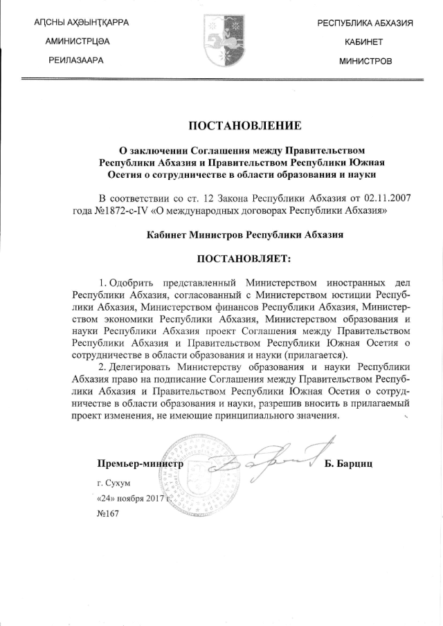 Постановление Кабинета Министров Республики Абхазия от 24.11.2017 № 167 "О заключении Соглашения между Правительством Республики Абхазия и Правительством Республики Южная Осетия о сотрудничестве в области образования и науки"