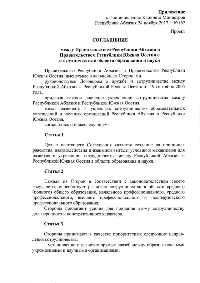 Постановление Кабинета Министров Республики Абхазия от 24.11.2017 № 167 "О заключении Соглашения между Правительством Республики Абхазия и Правительством Республики Южная Осетия о сотрудничестве в области образования и науки"