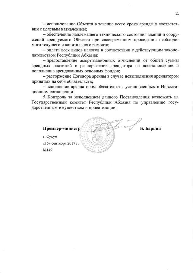 Постановление Кабинета Министров Республики Абхазия от 15.09.2017 № 149 "О передаче в аренду складских помещений и здания гаража"