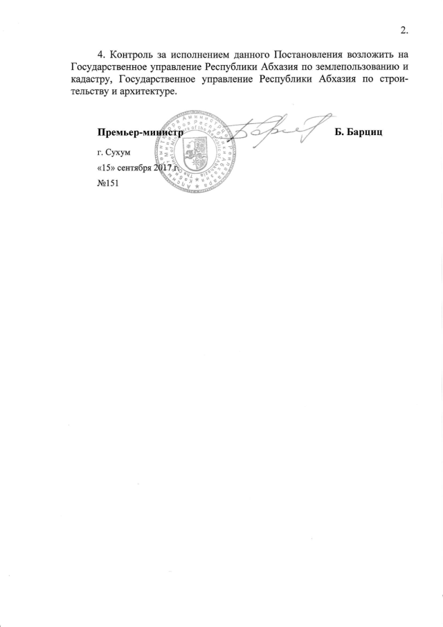 Постановление Кабинета Министров Республики Абхазия от 15.09.2017 № 151 "О даче согласия Администрации Гагрского района на предоставление ИП Багателия Н.Ш. 0,18 га земли в г. Пицунда для строительства санаторно-курортного объекта"
