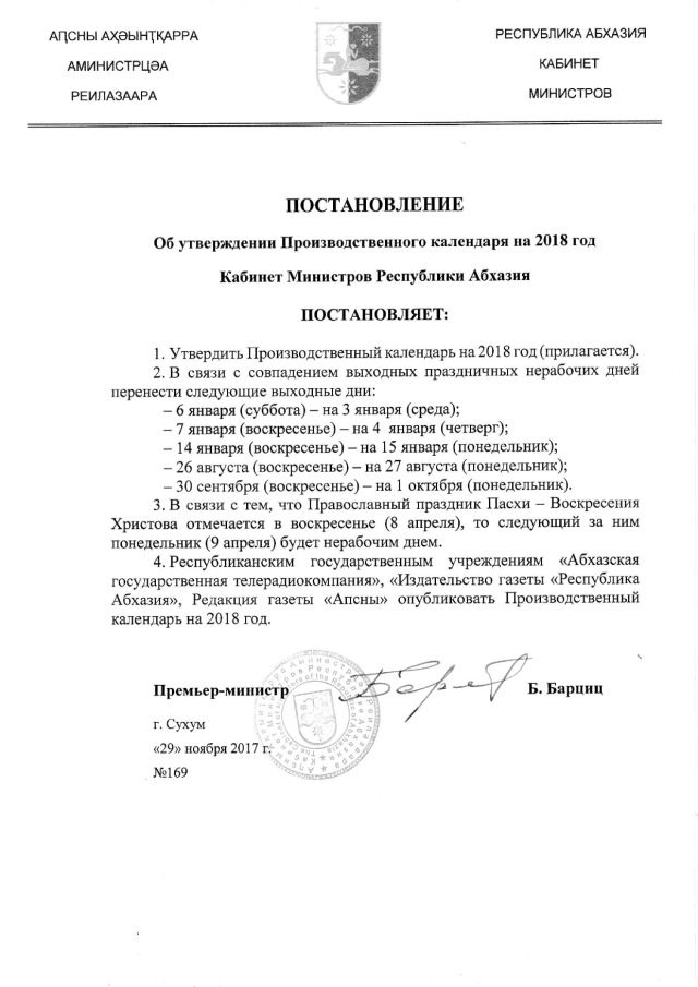 Постановление Кабинета Министров Республики Абхазия от 29.11.2017 № 169 "Об утверждении Производственного календаря на 2018 год"