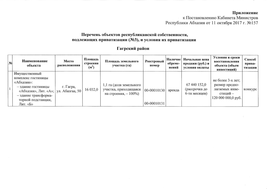 Постановление Кабинета Министров Республики Абхазия от 11.10.2017 № 157 "Об установлении Перечня объектов республиканской собственности, подлежащих приватизации, и условиях их приватизации"