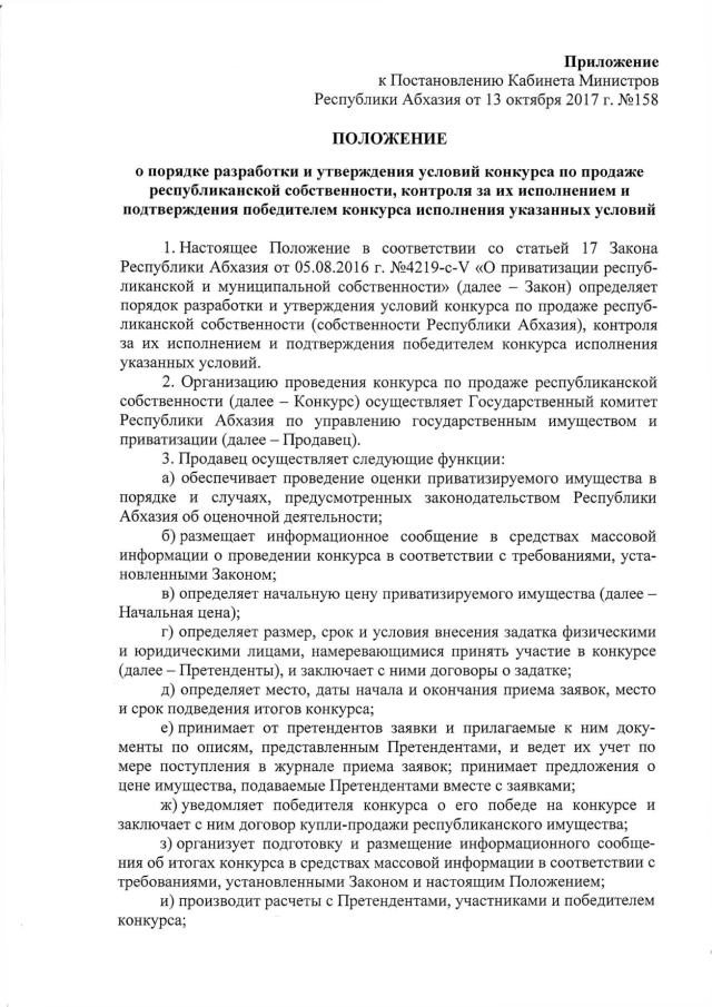 Постановление Кабинета Министров Республики Абхазия от 13.10.2017 № 158 "Об утверждении "Положения о порядке разработки и утверждения условий конкурса по продаже республиканской собственности, контроля за их исполнением и подтверждения победителем конкурса исполнения указанных условий"