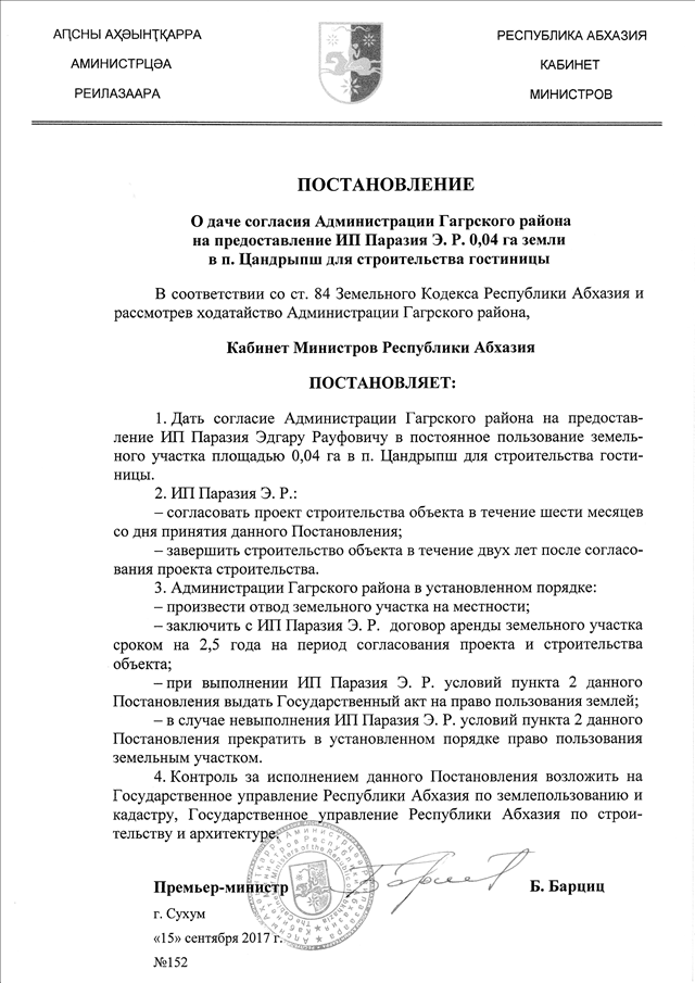 Постановление Кабинета Министров Республики Абхазия от 15.09.2017 № 152 "О даче согласия Администрации Гагрского района на предоставление ИП Паразия Э. Р. 0,04 га земли в п. Цандрыпш для строительства гостиницы"