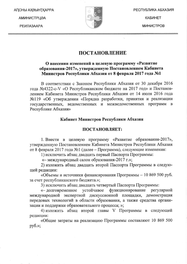 Постановление Кабинета Министров Республики Абхазия от 01.12.2017 № 170 "О внесении изменений в целевую программу "Развитие образования-2017", утвержденную Постановлением Кабинета Министров Республики Абхазия от 8 февраля 2017 года № 1"