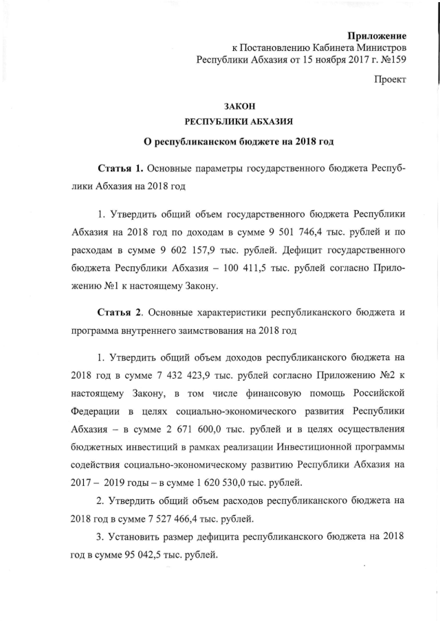 Постановление Кабинета Министров Республики Абхазия от 15.11.2017 № 159 "О проекте Закона Республики Абхазия "О республиканском бюджете на 2018 год"