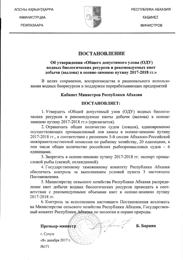 Постановление Кабинета Министров Республики Абхазия от 08.12.2017 № 171 "Об утверждении "Общего допустимого улова (ОДУ) водных биологических ресурсов и рекомендуемых квот добычи (вылова) в осенне-зимнюю путину 2017-2018 гг."