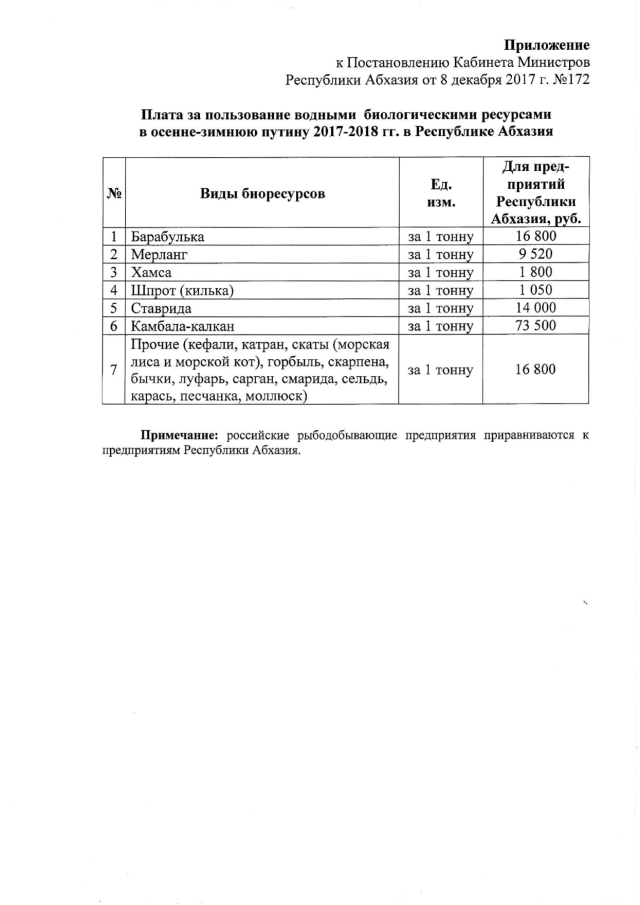 Постановление Кабинета Министров Республики Абхазия от 08.12.2017 № 172 "О плате за пользование водными биологическими ресурсами в осенне-зимнюю путину 2017-2018 гг. в Республике Абхазия"