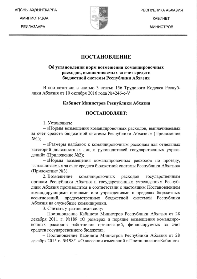 Постановление Кабинета Министров Республики Абхазия от 27.12.2017 № 182 "Об установлении норм возмещения командировочных расходов, выплачиваемых за счет средств бюджетной системы Республики Абхазия"