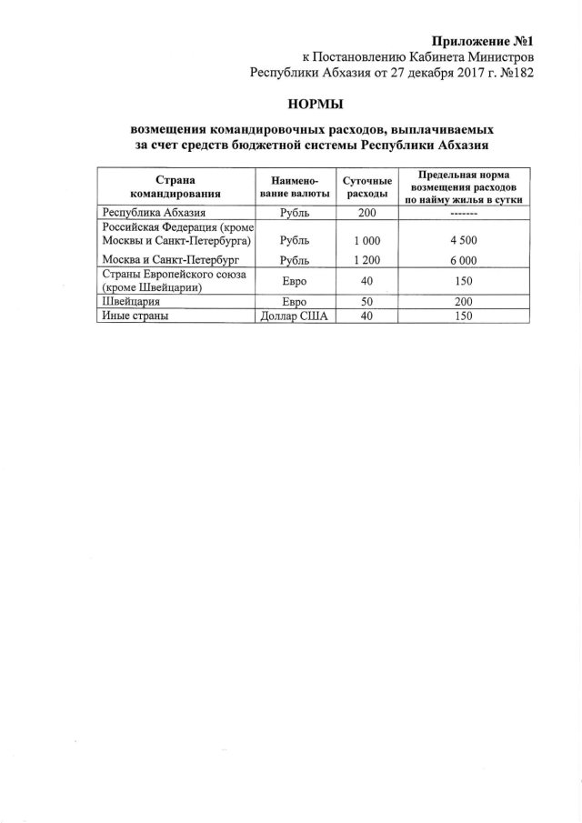 Постановление Кабинета Министров Республики Абхазия от 27.12.2017 № 182 "Об установлении норм возмещения командировочных расходов, выплачиваемых за счет средств бюджетной системы Республики Абхазия"