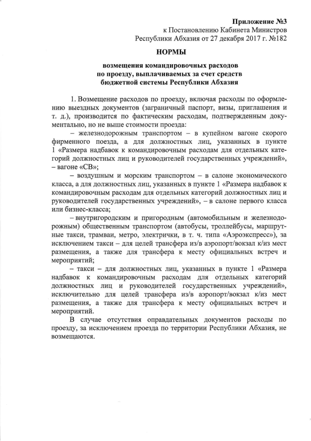 Постановление Кабинета Министров Республики Абхазия от 27.12.2017 № 182 "Об установлении норм возмещения командировочных расходов, выплачиваемых за счет средств бюджетной системы Республики Абхазия"