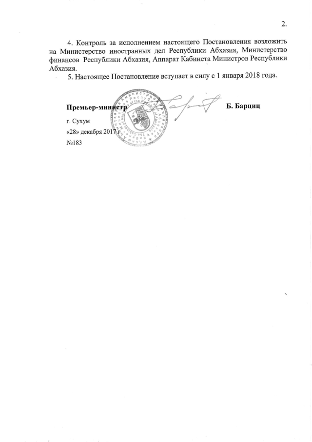 Постановление Кабинета Министров Республики Абхазия от 28.12.2017 № 183 "Об утверждении межведомственной целевой программы на 2018 год "Финансово-материальное обеспечение деятельности компетентных центральных органов государственного управления и должностных лиц, направленной на реализацию внешнеполитических задач по представлению интересов Республики Абхазия на международных Женевских дискуссиях по безопасности и стабильности на Южном Кавказе"