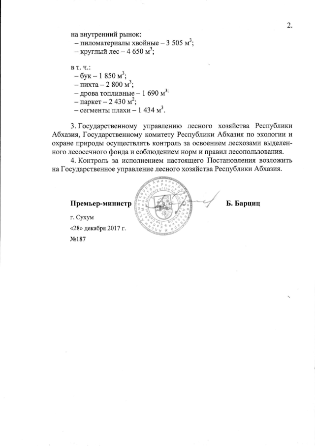 Постановление Кабинета Министров Республики Абхазия от 28.12.2017 № 187 "Об утверждении лесосечного фонда и лесовосстановительных работ в лесах Республики Абхазия на 2018 год"