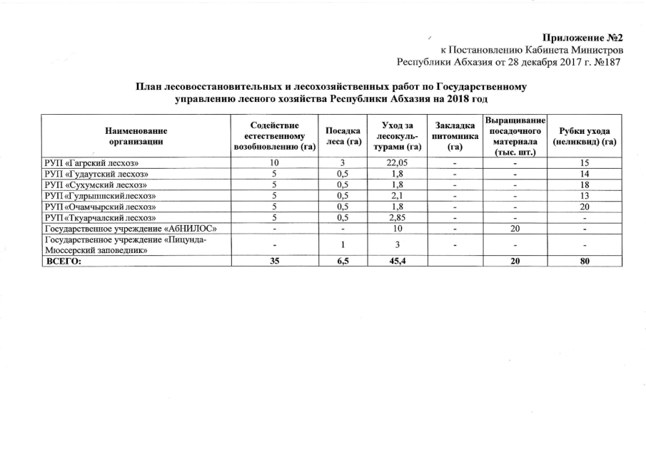 Постановление Кабинета Министров Республики Абхазия от 28.12.2017 № 187 "Об утверждении лесосечного фонда и лесовосстановительных работ в лесах Республики Абхазия на 2018 год"