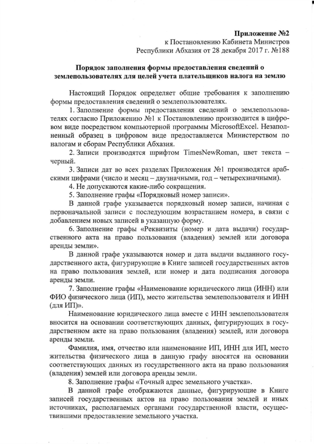 Постановление Кабинета Министров Республики Абхазия от 28.12.2017 № 188 "О мерах по повышению эффективности учета налогооблагаемой базы и администрирования налога на землю"