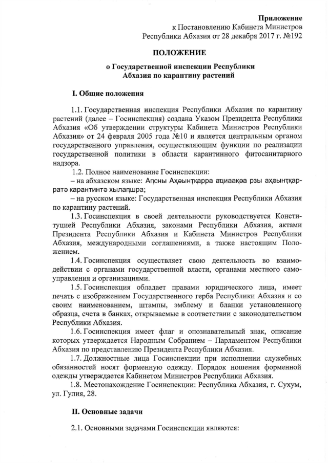 Постановление Кабинета Министров Республики Абхазия от 28.12.2017 № 192 "Об утверждении "Положения о Государственной инспекции Республики Абхазия по карантину растений"