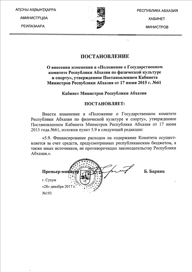 Постановление Кабинета Министров Республики Абхазия от 28.12.2017 № 193 "О внесении изменения в "Положение о Государственном комитете Республики Абхазия по физической культуре и спорту", утвержденное Постановлением Кабинета Министров Республики Абхазия от 17 июня 2015 г. № 61"