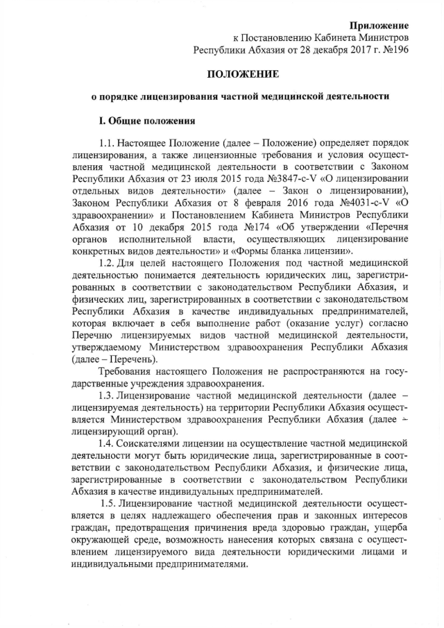 Постановление Кабинета Министров Республики Абхазия от 28.12.2017 № 196 "Об утверждении "Положения о порядке лицензирования частной медицинской деятельности"