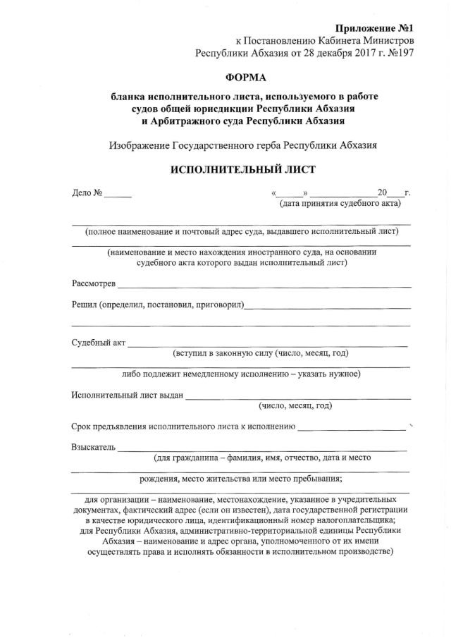 Постановление Кабинета Министров Республики Абхазия от 28.12.2017 № 197 "Об утверждении "Формы бланка исполнительного листа, используемого в работе судов общей юрисдикции Республики Абхазия и Арбитражного суда Республики Абхазия", "Порядка изготовления, учета, хранения и уничтожения бланков исполнительных листов, используемых в работе судов общей юрисдикции Республики Абхазия и Арбитражного суда Республики Абхазия"