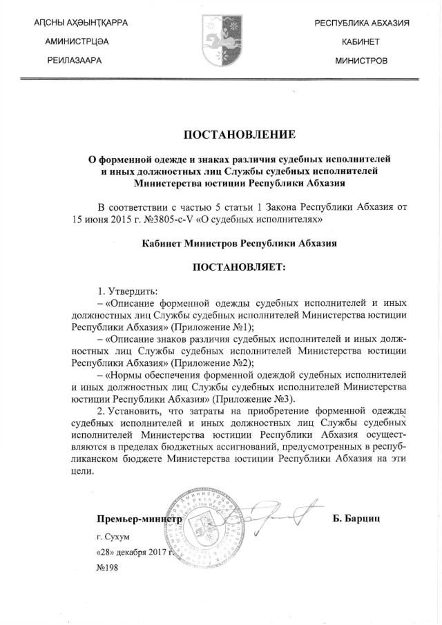 Постановление Кабинета Министров Республики Абхазия от 28.12.2017 № 198 "О форменной одежде и знаках различия судебных исполнителей и иных должностных лиц Службы судебных исполнителей Министерства юстиции Республики Абхазия"