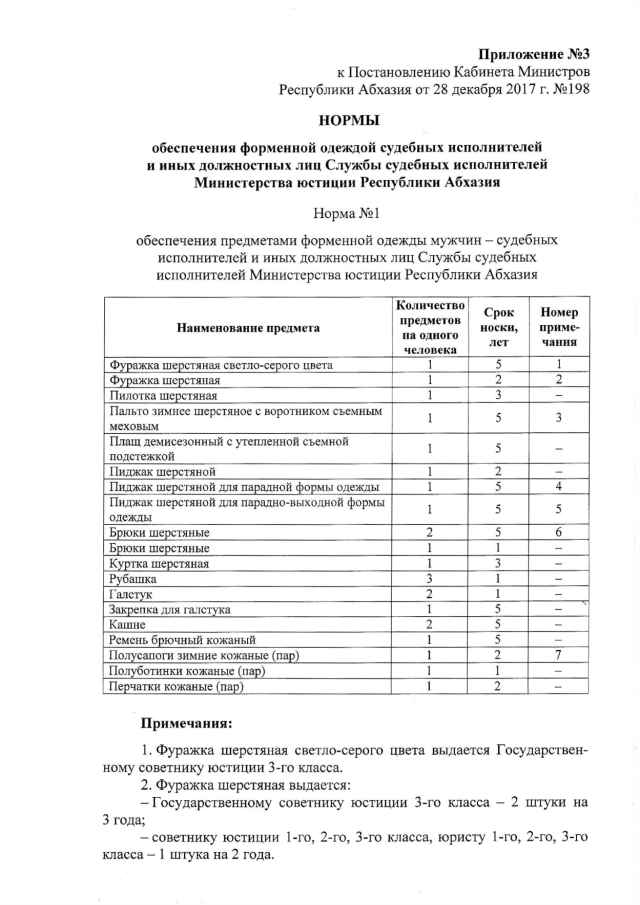 Постановление Кабинета Министров Республики Абхазия от 28.12.2017 № 198 "О форменной одежде и знаках различия судебных исполнителей и иных должностных лиц Службы судебных исполнителей Министерства юстиции Республики Абхазия"