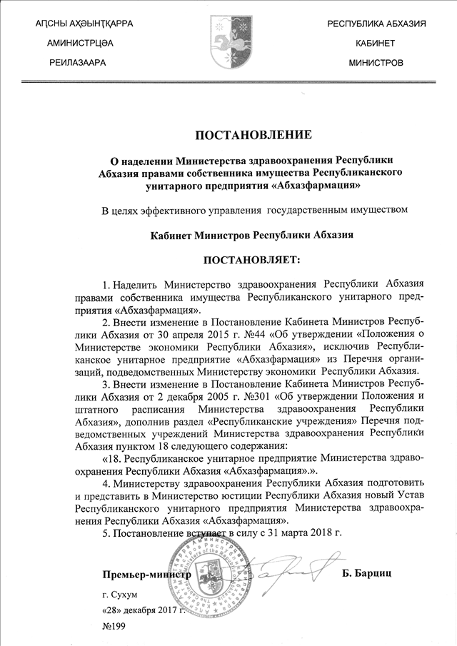 Постановление Кабинета Министров Республики Абхазия от 28.12.2017 № 199 "О наделении Министерства здравоохранения Республики Абхазия правами собственника имущества Республиканского унитарного предприятия "Абхазфармация"