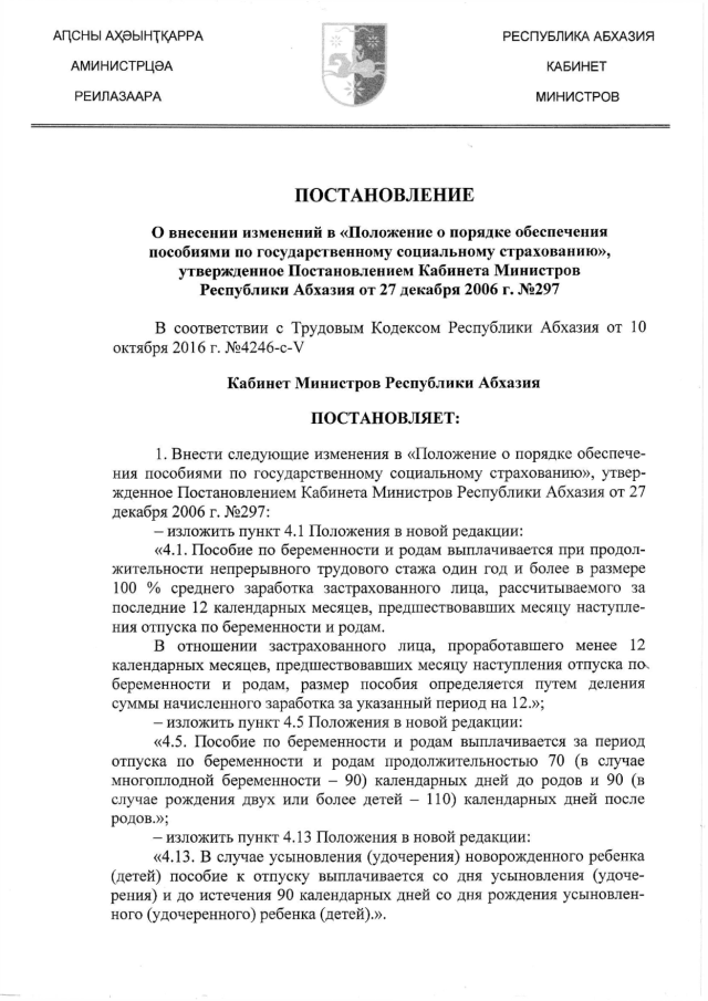 Постановление Кабинета Министров Республики Абхазия от 28.12.2017 № 201 "О внесении изменений в "Положение о порядке обеспечения пособиями по государственному социальному страхованию", утвержденное Постановлением Кабинета Министров Республики Абхазия от 27 декабря 2006 г. № 297"