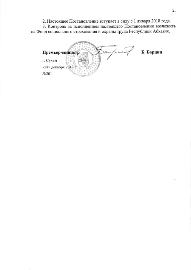 Постановление Кабинета Министров Республики Абхазия от 28.12.2017 № 201 "О внесении изменений в "Положение о порядке обеспечения пособиями по государственному социальному страхованию", утвержденное Постановлением Кабинета Министров Республики Абхазия от 27 декабря 2006 г. № 297"