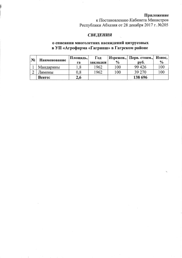 Постановление Кабинета Министров Республики Абхазия от 28.12.2017 № 205 "О списании многолетних насаждений цитрусовых в УП "Агрофирма "Гагрипш" в Гагрском районе"