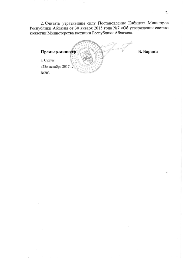 Постановление Кабинета Министров Республики Абхазия от 28.12.2017 № 203 "Об утверждении состава коллегии Министерства юстиции Республики Абхазия"